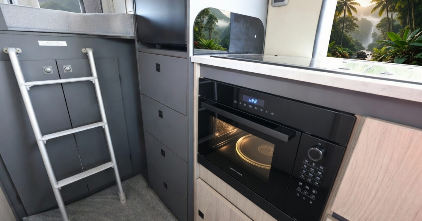 The 68 XL includes a purpose-built rear garage with secure space for two bikes, keeping gear protected and out of the living area.