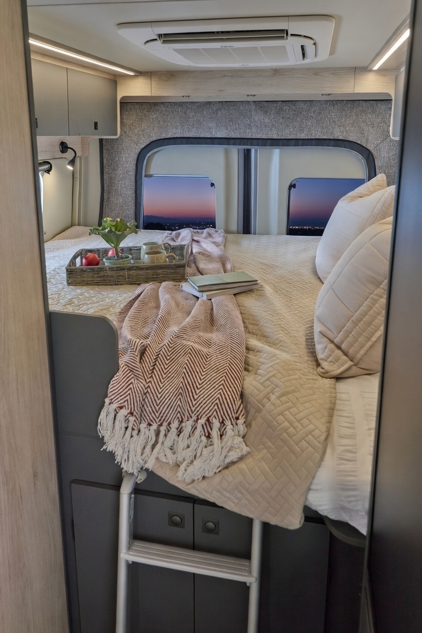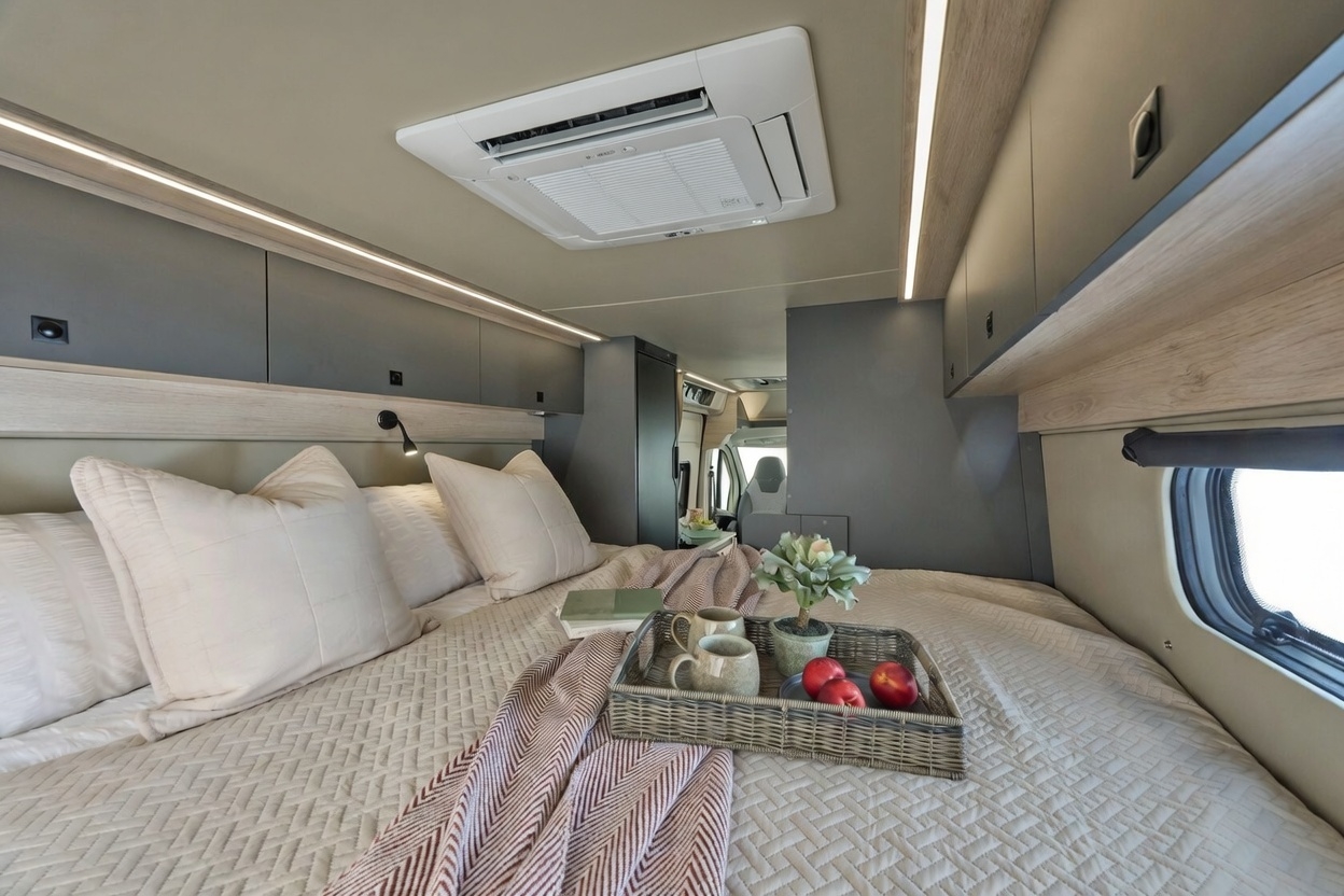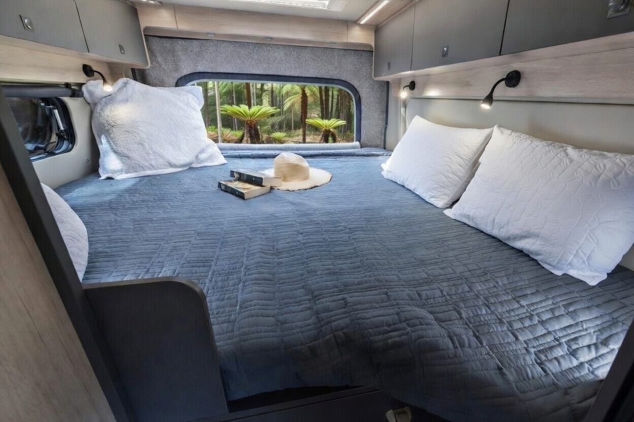 The rear sleeping area can be either twin singles or a king bed configuration, giving you a quiet, comfortable place to rest as soon as you park.