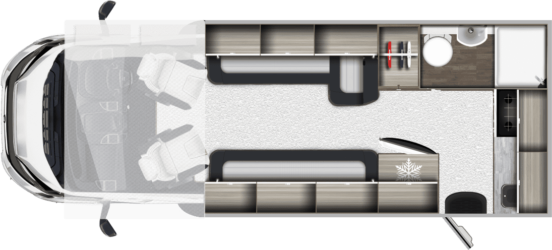 The Hi-Line variant also features the unique Skyline sunroof. The overcall area has been designed to accommodate a large double bed. Every inch of space has been fully utilised to provide a large and comfortable sleeping area. During the day, this sleeping area can quickly slide away, enabling you take use the space.